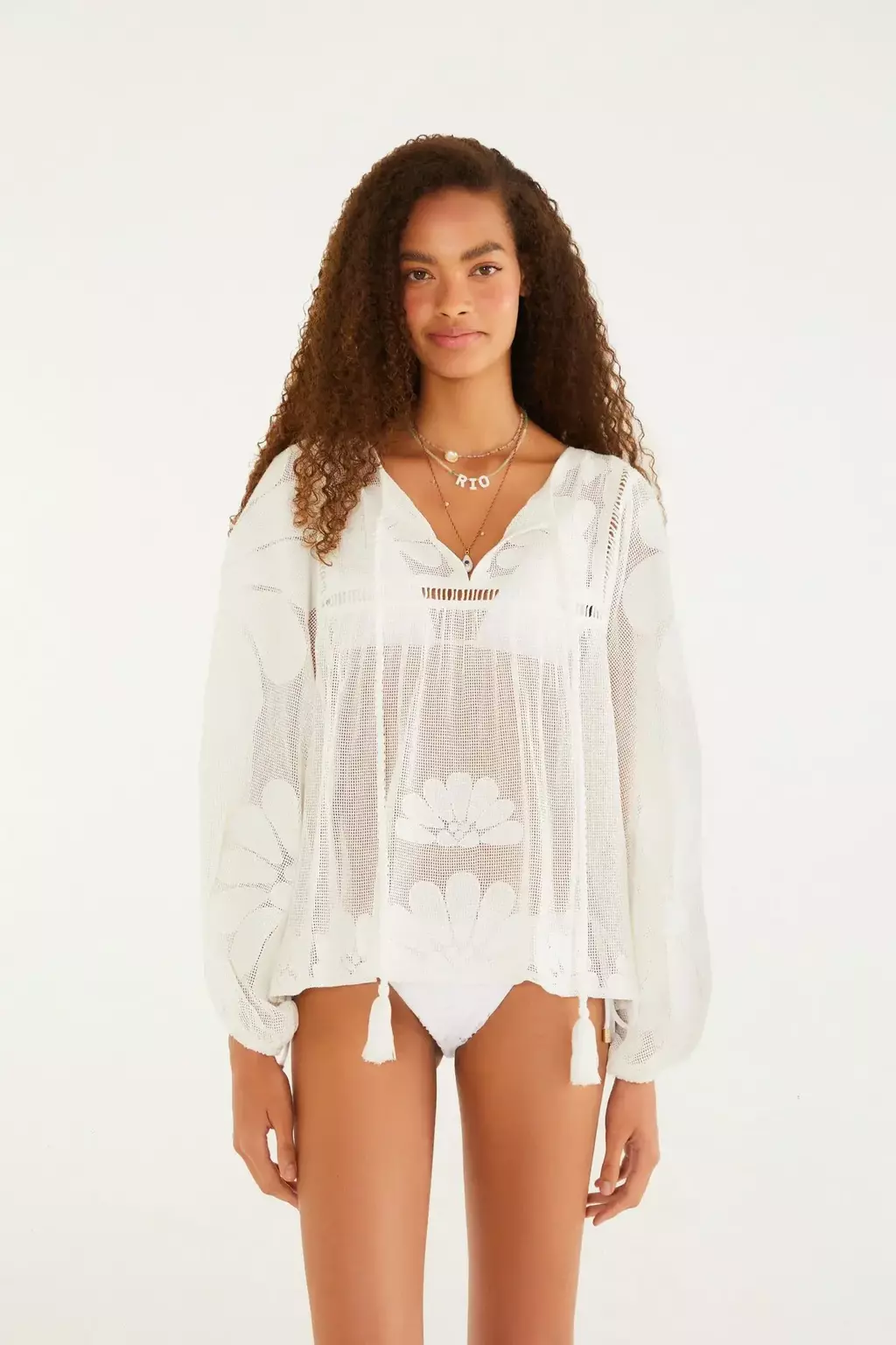 bata tela cutwork palermo. decote em v com delicadas cordinhas para amarração e charmosa aplicação de tassel nas pontas. mangas longas com leve franzido e punhos ajustáveis para um toque casual. o corte fluido e os detalhes vazados fazem dela uma escolha perfeita para encontros ao ar livre. FARM RIO original - alto verão 26.