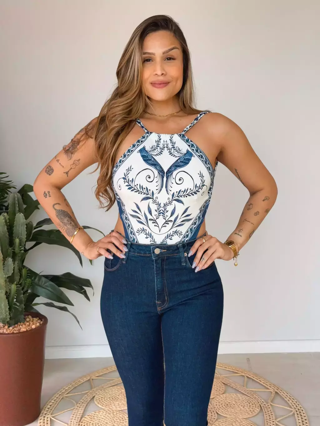 body estampado nina. apresenta modelagem ajustada ao corpo com decote alto e alças finas que cruzam nas costas, criando um design único e atraente. confeccionado em tecido leve, garante conforto enquanto valoriza combinações versáteis, perfeitas para dias ensolarados. FARM RIO original - verão 26.