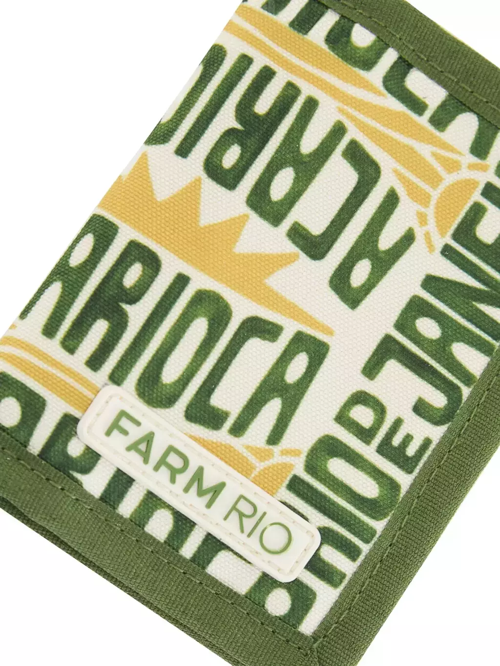 A peça possui, tamanho pequeno, formato retangular, compartimento interno, seis divisórias para cartões, bolso pequeno interno com fechamento por zíper, estampa figurativa de escrita em cores contrastantes, tag emborrachada da marca aplicada na parte frontal, duas abas sobrepostas e fechamento frontal por velcro.