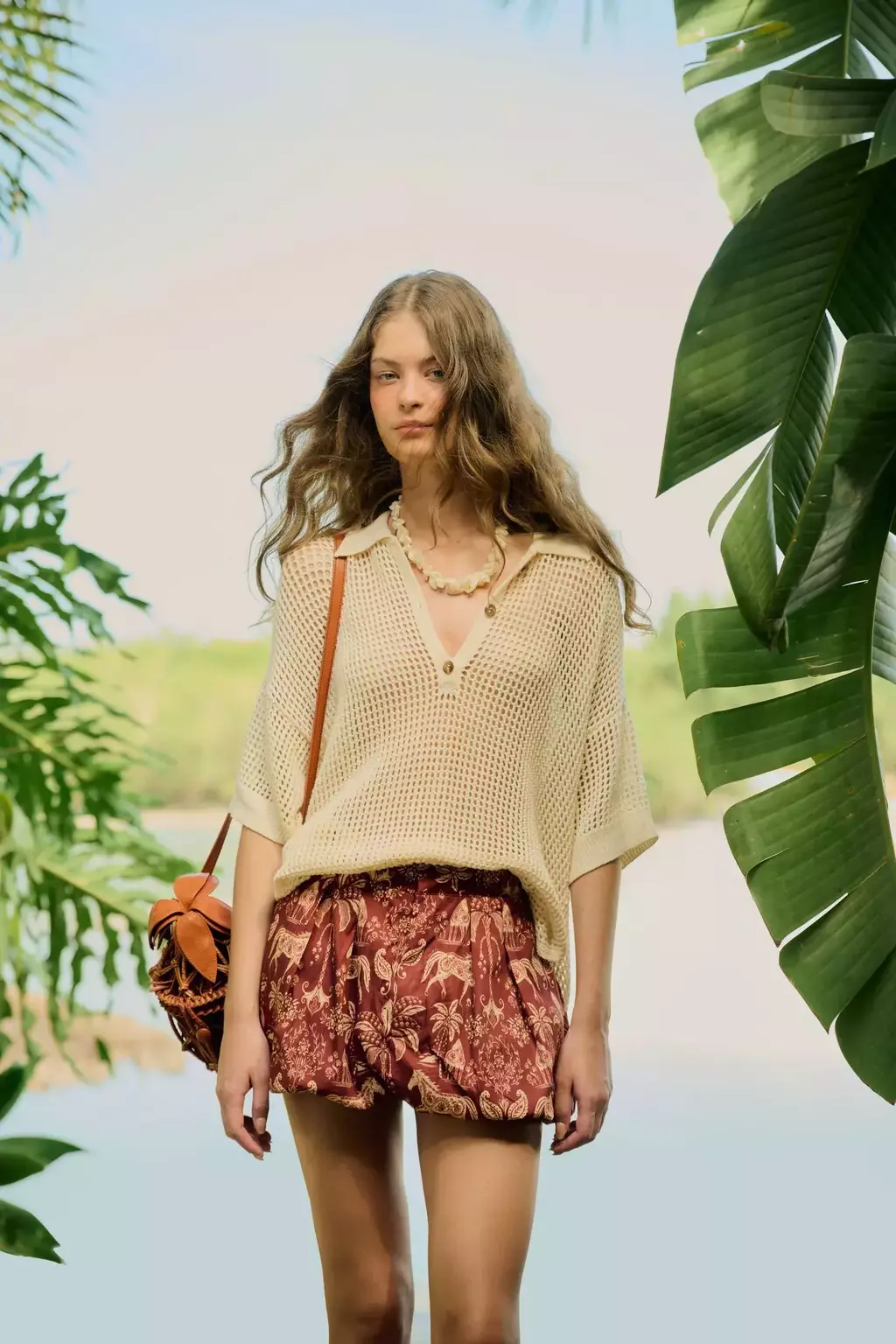 polo tricot telado é a escolha perfeita para quem busca um toque único em qualquer ocasião. com gola clássica e fecho frontal, as mangas amplas caem de forma leve e confortável. a trama delicada adiciona personalidade à peça, ideal para combinações com shorts ou calças. FARM RIO original - verão 26. só tem 1 PP P M