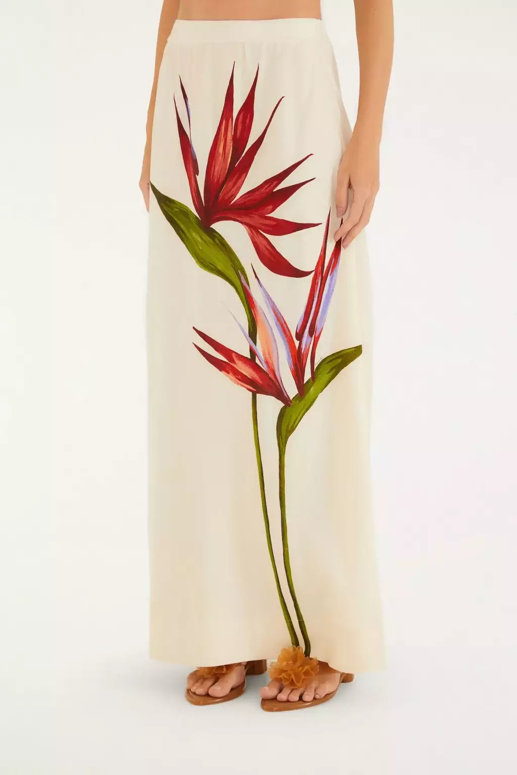 saia estampada maxi estrelícia. com cintura alta e corte fluido, a saia traz uma estampa que exala brasilidade. o detalhe do cós ajustável e os acabamentos cuidadosos oferecem conforto e estilo para dias leves e ocasiões especiais. permita-se vivenciar a essência tropical em cada movimento. FARM RIO original - verão 26.