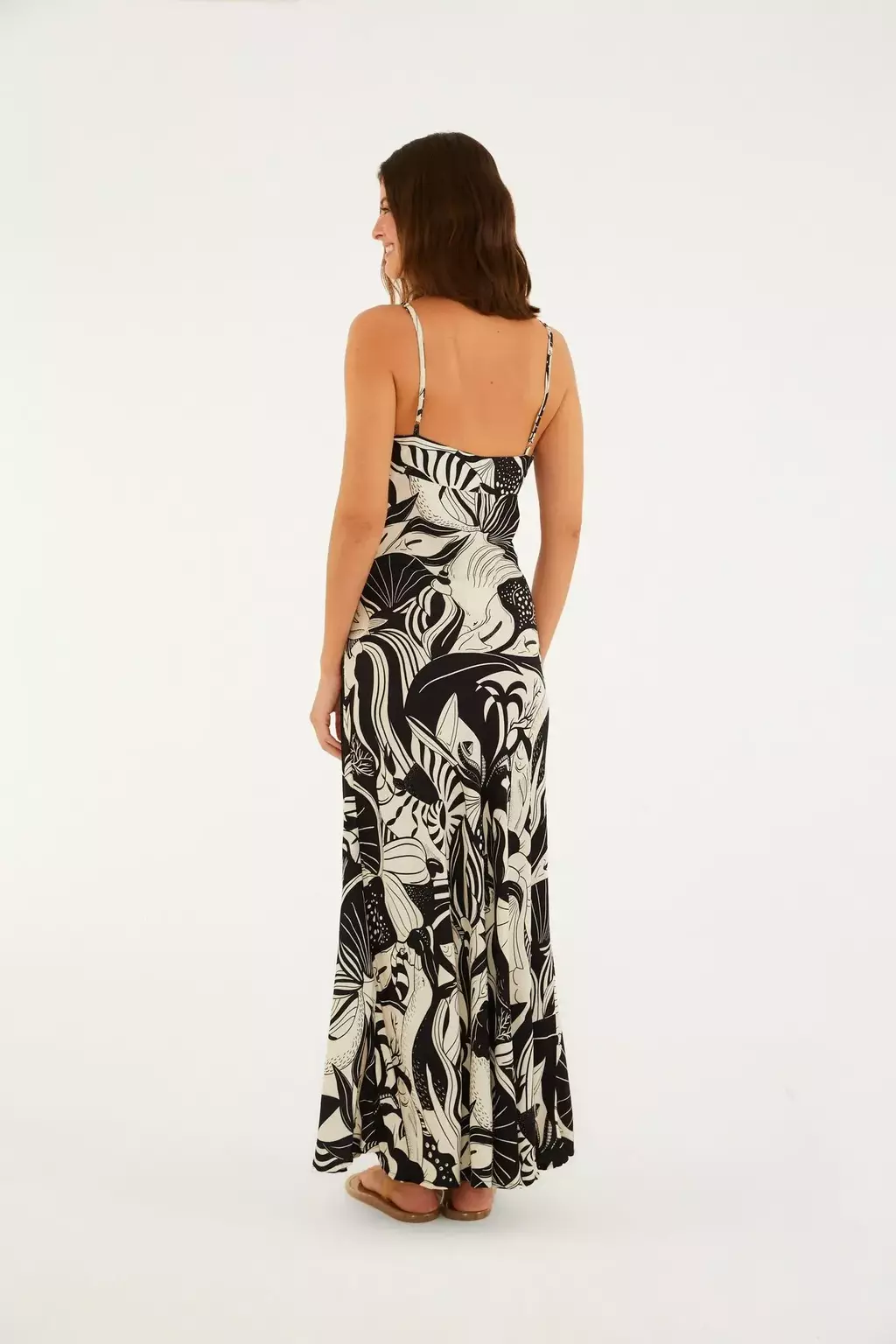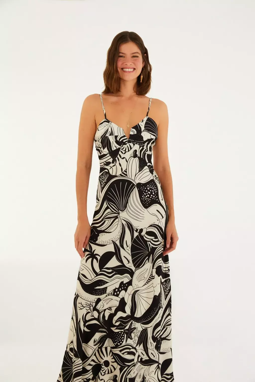 vestido alcinhas estampado festa de mar. o decote em v aliado às alças finas traz um toque leve e refrescante. a modelagem fluída proporciona liberdade e conforto. o acabamento cuidadoso faz desta peça uma escolha única para eventos casuais, passeios ao ar livre ou um encontro especial. FARM RIO original - verão 26.