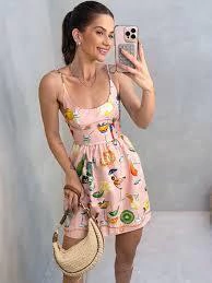 Vestido curto em tecido plano com estampa festiva e divertida. Decote canoa na frente, alças que transpassam e amarram nas costas, com recorte vazado e elástico para ajuste. Modelagem evasê leve e charmosa, ideal para compor looks alegres e descontraídos.