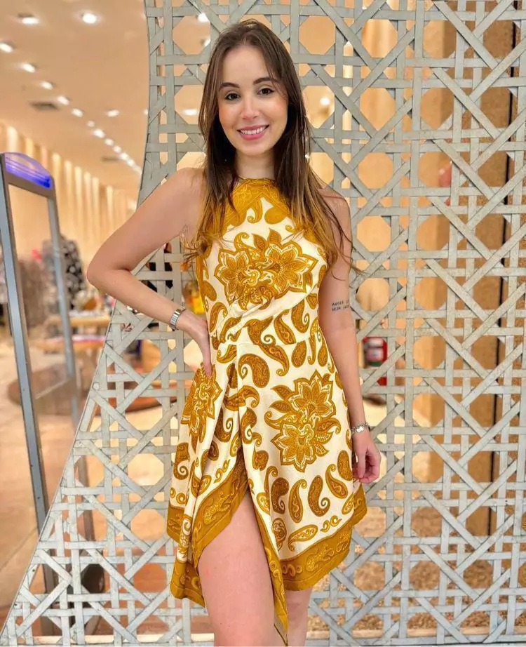 confeccionado em tecido leve sem elasticidade. A peça solta ao corpo possui decote haltér, alças em tiras finas alongadas com ponteira em miçangas para amarração posterior, recortes frontais, elástico embutido na parte posterior, barra assimétrica com fenda laterai, estampa paisley em tons contrastantes e comprimento curto.