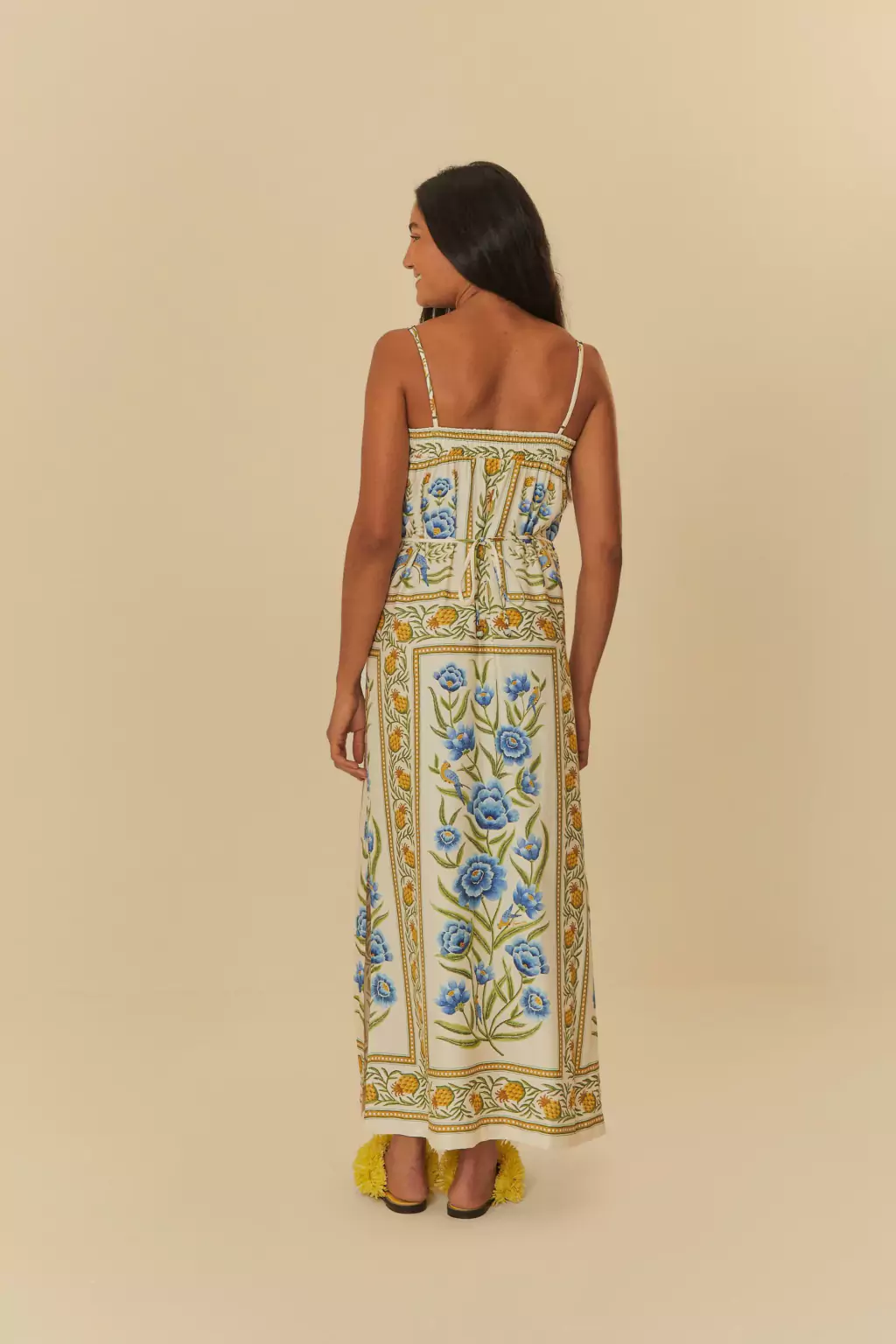 vestido longo estampado puglia. confeccionado em tecido leve, possui alças finas reguláveis, decote reto e aberturas laterais na saia, oferecendo conforto e estilo. a estampa exclusiva adiciona charme a qualquer ocasião, seja para um almoço ao ar livre ou um passeio à tarde. esta é uma peça exclusiva da coleção FARM RIO original