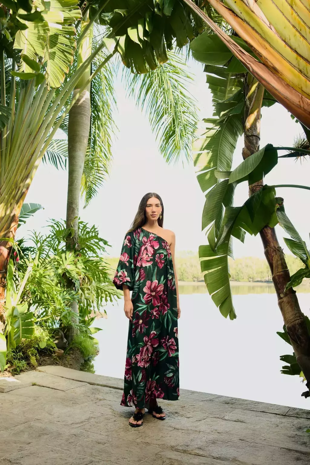 vestido longo ombro só estampado lineia. destaca-se pelo design assimétrico com um ombro à mostra, trazendo um toque único. as mangas amplas e o caimento fluido proporcionam conforto e leveza. perfeito para ocasiões casuais ou eventos ao ar livre, este vestido eleva qualquer produção. FARM RIO original - verão 26.