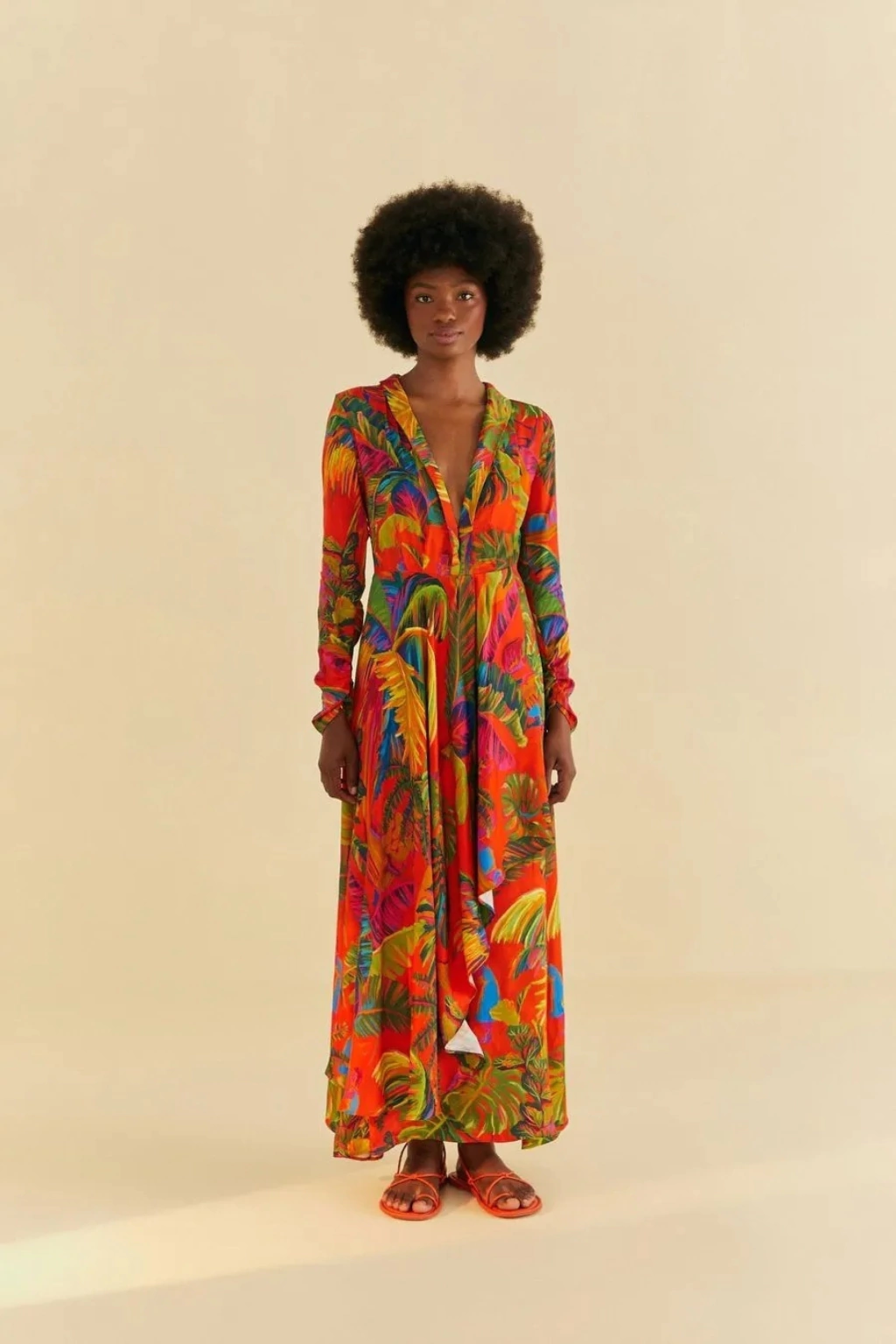 vestido longo manga estampado selva urbana. possui golinha dobrada acompanhando o decote em v com detalhe de um colchete finalizando o decote. mangas longas com costura vertical nos punhos. tem pregas abertas abaixo do cós. o modelo é soltinho de viscose e possui recorte assimétrico finalizando o barrado. essa é uma peça da coleção farm rio do brasil