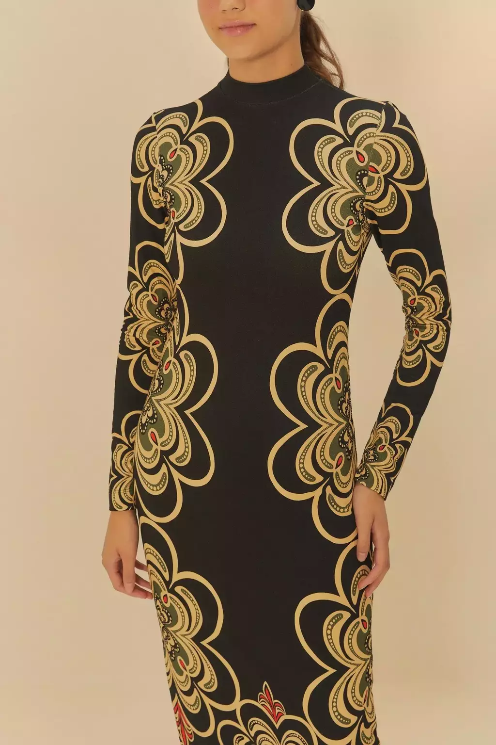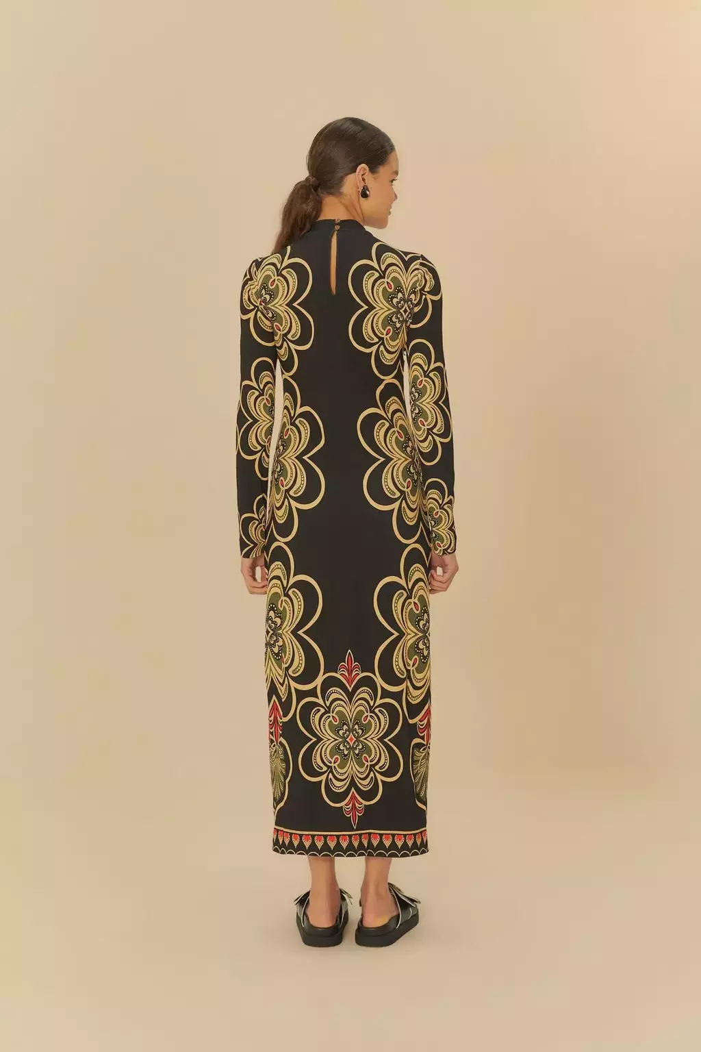 vestido midi estampado gráfico místico. com modelagem elegante, esse vestido apresenta mangas longas e gola alta, elevando qualquer produção. a estampa única da peça transforma-a em um verdadeiro destaque, ideal para encontros casuais ou eventos formais. confeccionado em tecido suave, proporciona conforto e estilo em todas as ocasiões. FARM RIO original.