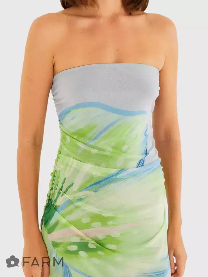 O vestido tule lírio tropical é uma peça da marca Farm e faz parte da coleção Alto Verão 26. Ele é descrito como uma peça que combina estilo, conforto e tendência, com uma estampa exclusiva inspirada na exuberância dos lírios, sem alças, com detalhes drapeados para melhor ajuste e conforto